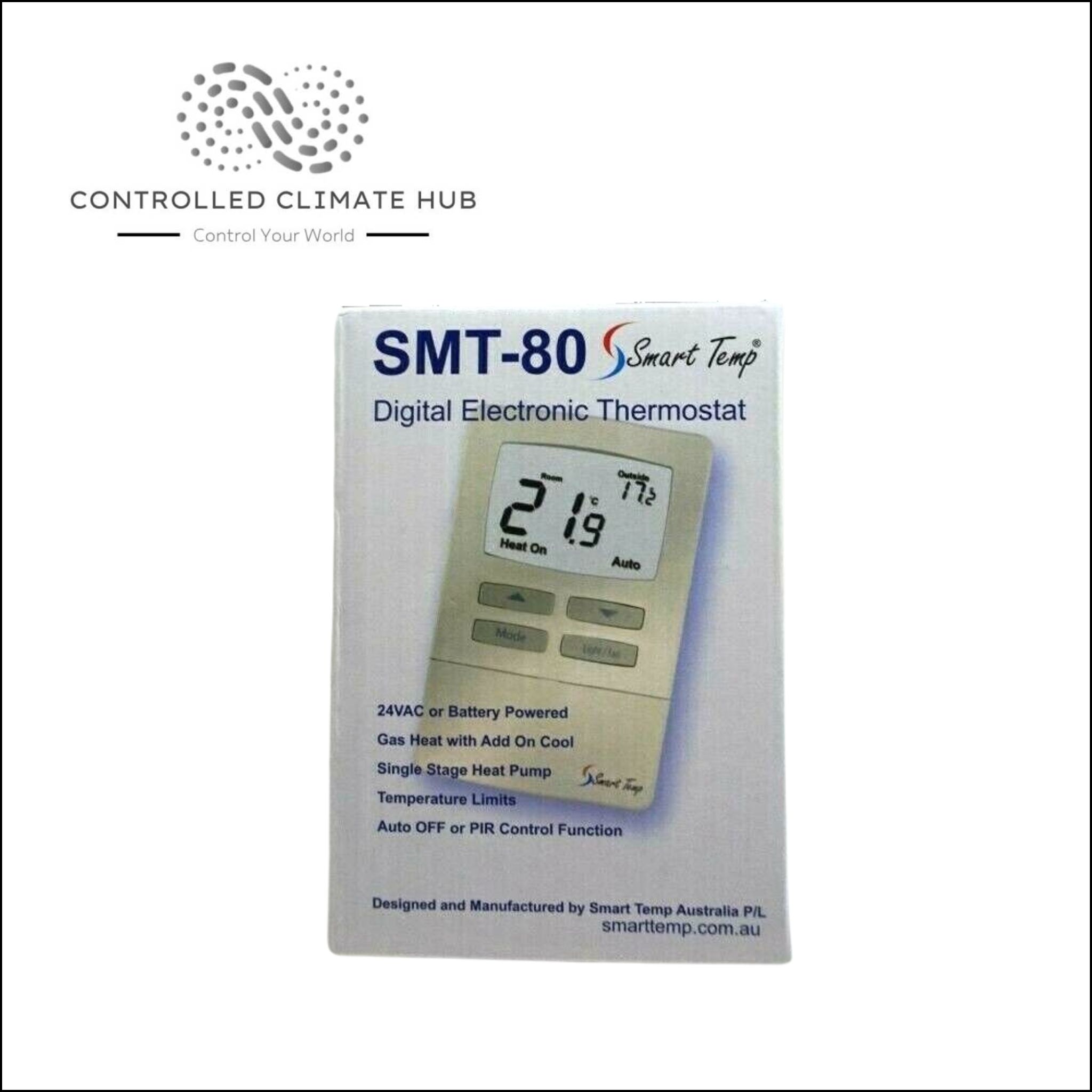 The Smart Temp SMT-80 is a digital, non-programmable thermostat that has many energy saving functions. It will control your heating and/or cooling system precisely and in an energy efficient manner.